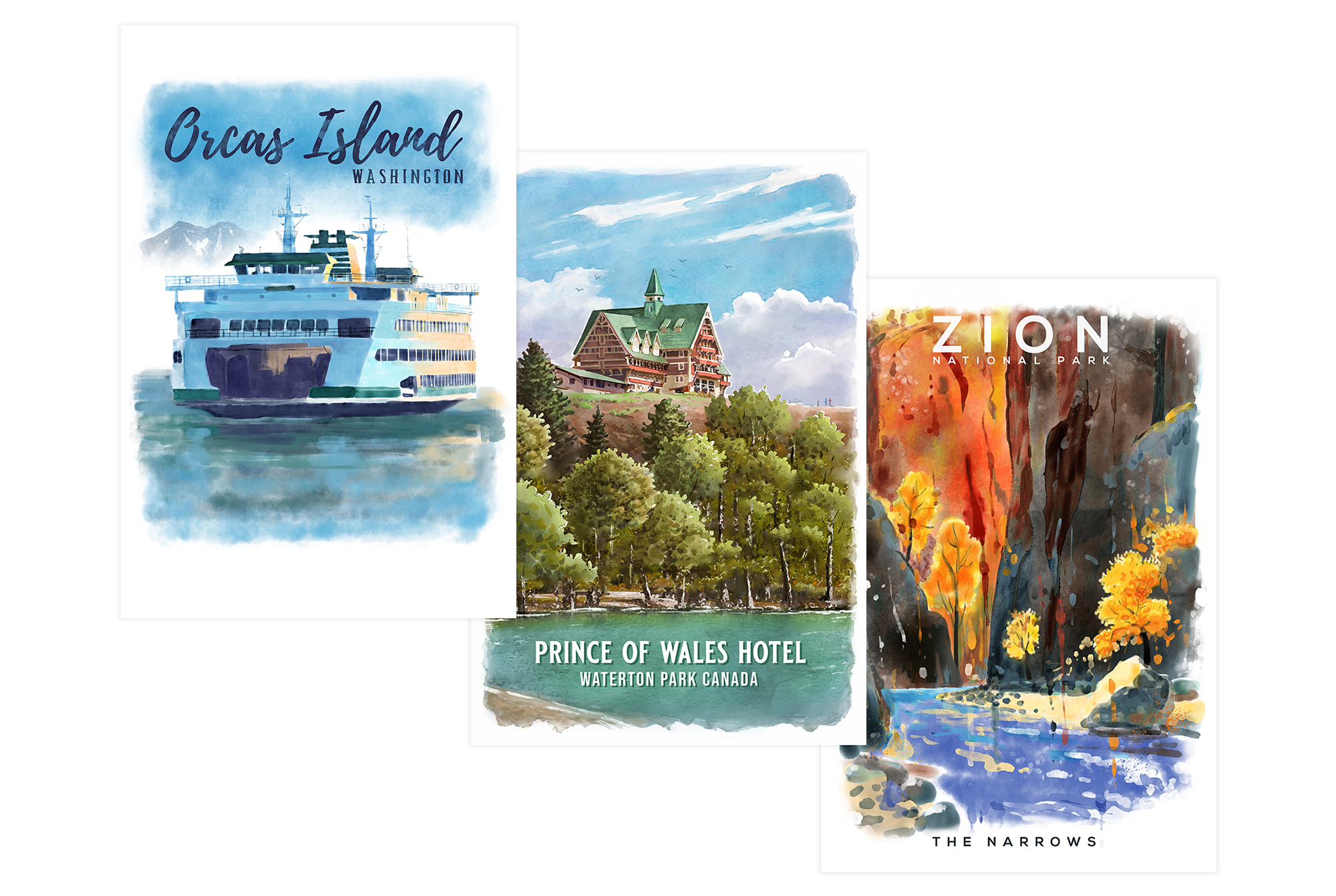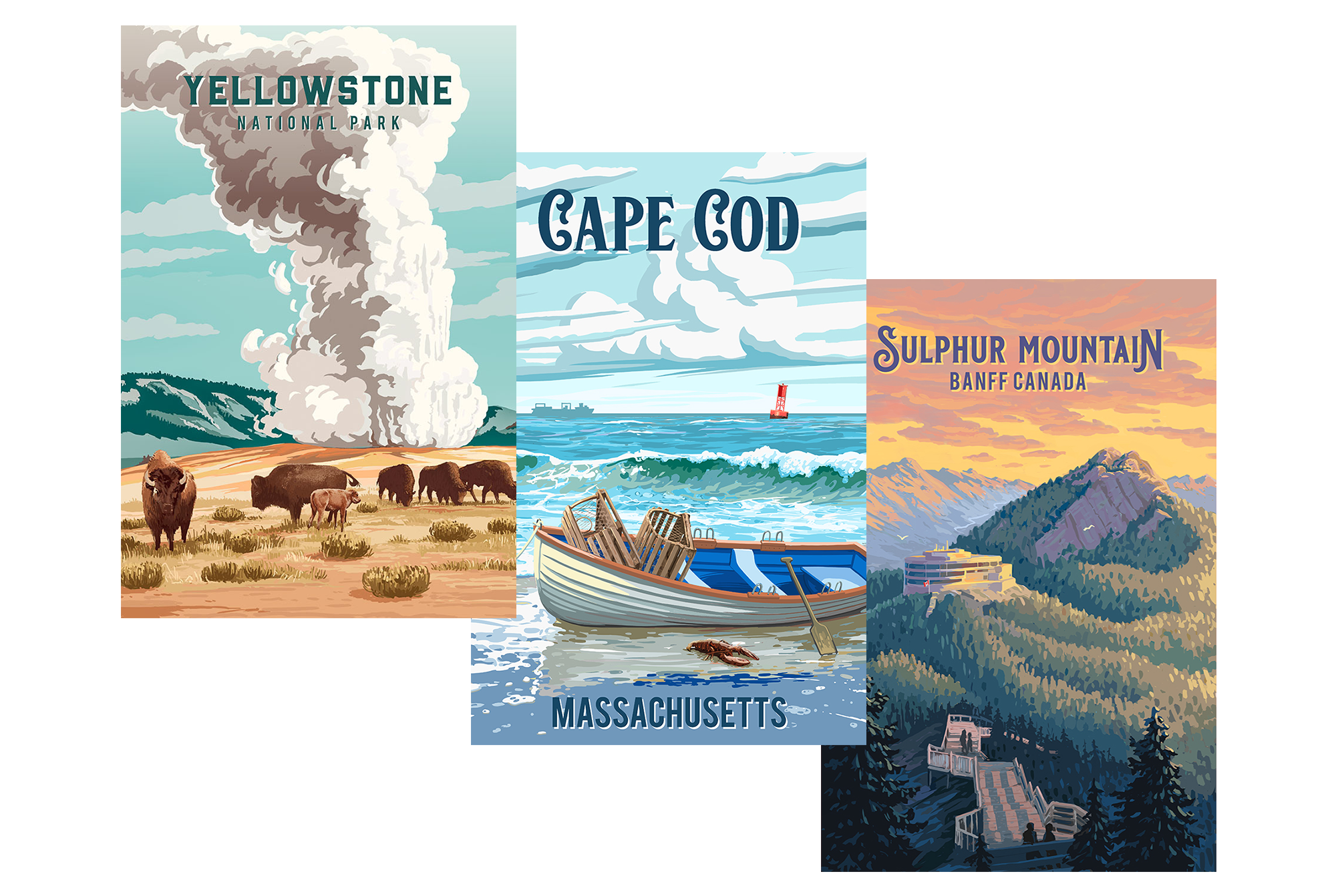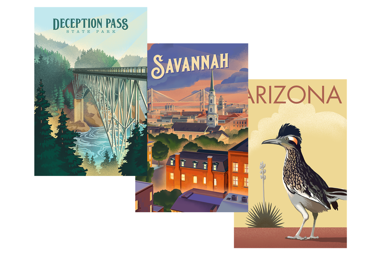 Inspired by WPA posters from the first half of the 20th century, this versatile art style features strong, glowing locations with subtle texture and shading. It’s finished with a name drop that’s a perfect stylistic match.