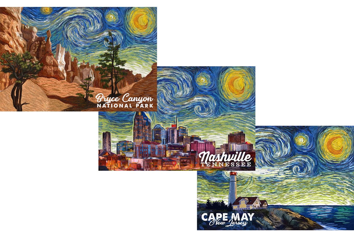 Your location hand-painted with a starry sky inspired by Van Gogh and finished with a name drop.