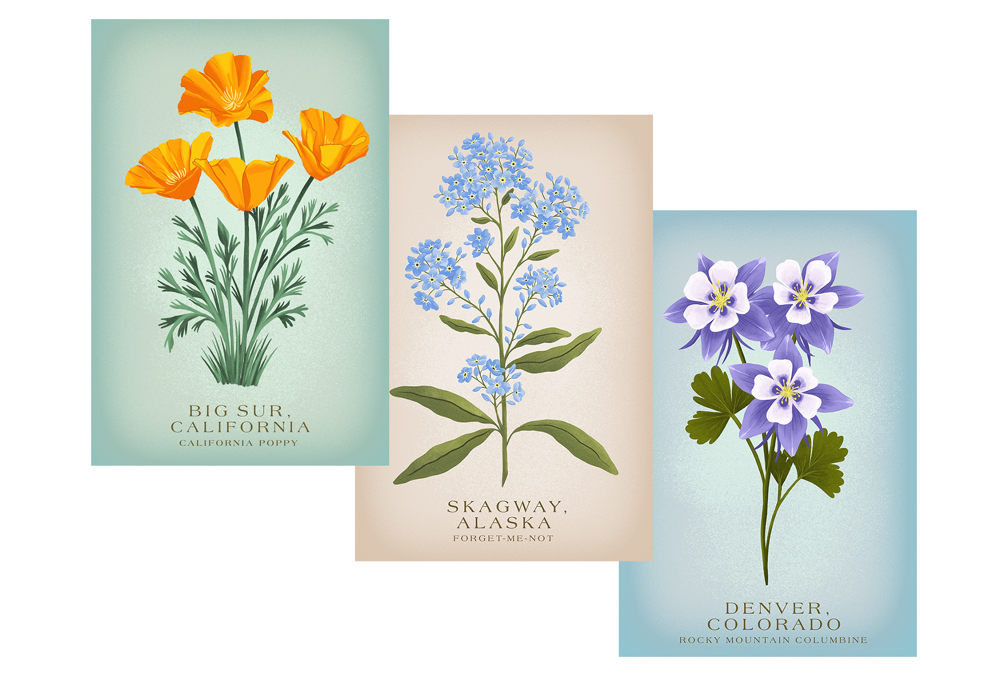 This revitalized vintage style captures the details of beautiful flora in a graphic yet realistic way. The earthen colors and the parchment-like background evoke vintage sketchbooks of the masters. We offer options for your state flower and flowers prominent in your location.